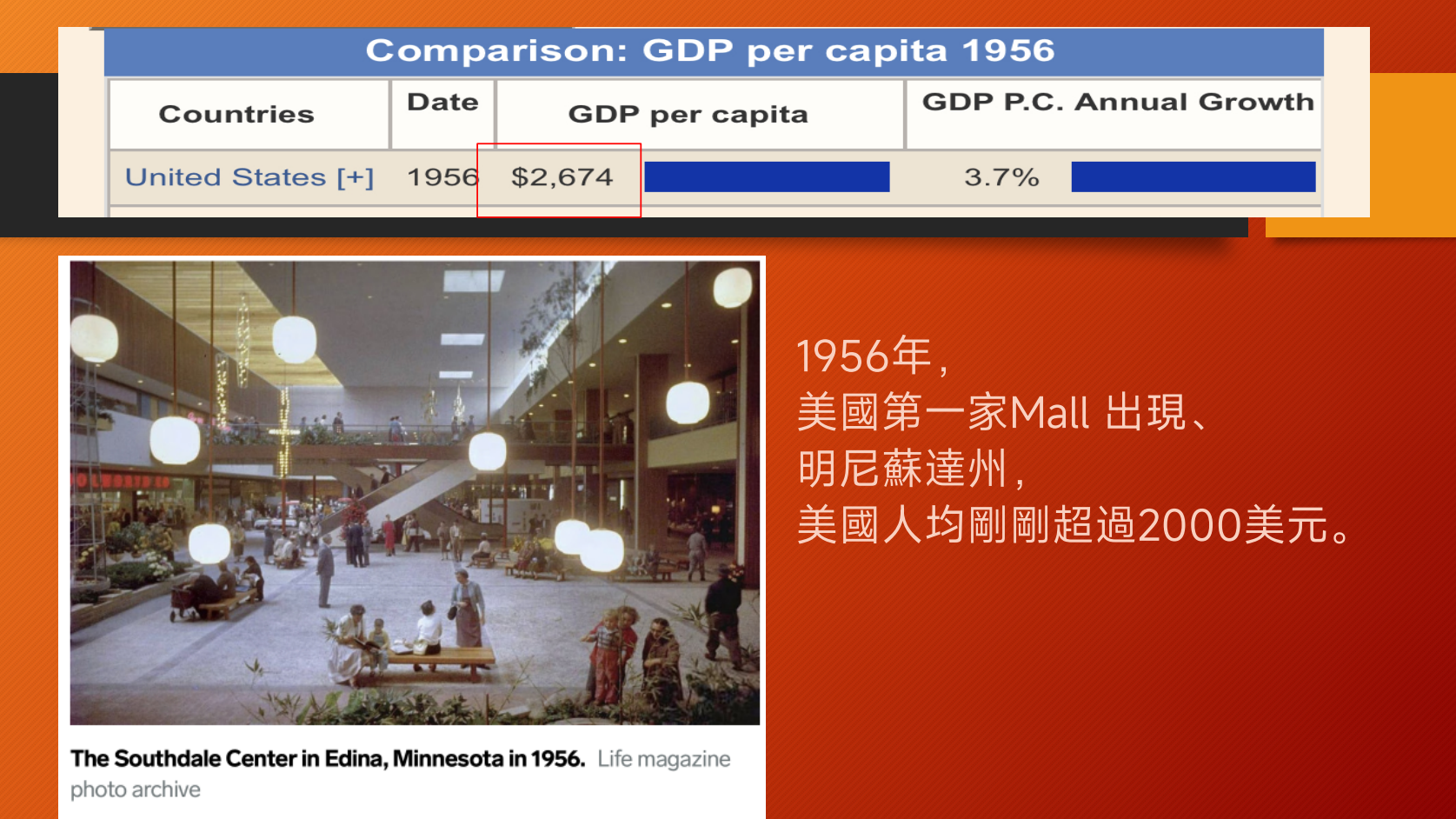 人均GDP达到2000美元,对老百姓意味着什么呢?Shopping Mall(大型购物中心)这种商业形式就是在美国人均GDP超过2000美元后才出现的。因为这种大型购物中心的背后,必须有庞大的资金流、物流、人流和巨大的能耗,投资额是惊人的,动辄数亿数十亿,而支撑它的正是人们的消费能力。因此可以说,这一阶段意味着居民的消费能力大大提高,消费结构也会变化。