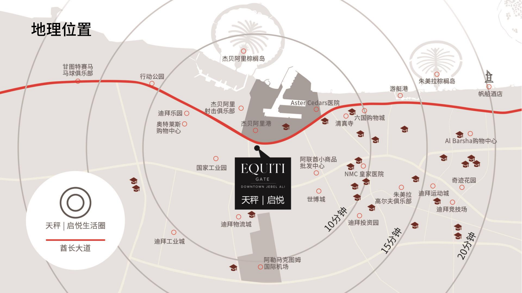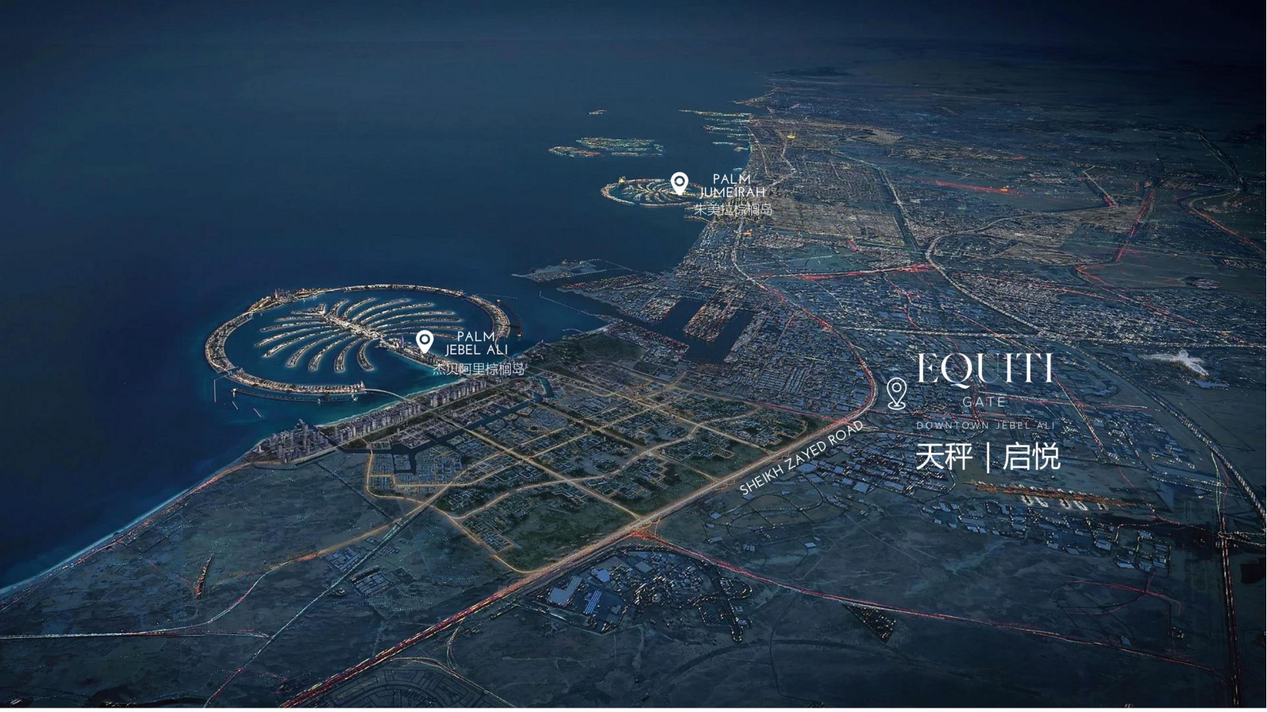 迪拜精装准现房公寓,Equiti Gate - 迪拜天秤·启悦坐落于迪拜著名的酋长大道谢赫扎耶德路旁,交通十分便捷。同时位于朱美拉棕榈岛和杰贝阿里棕榈岛之间,地段价值凸显。